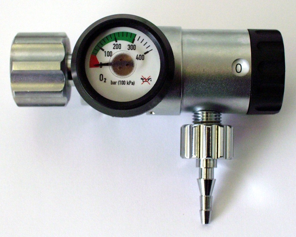 Am Handrad einstellbar, schwarzer Gummischutzring um den Manometer.