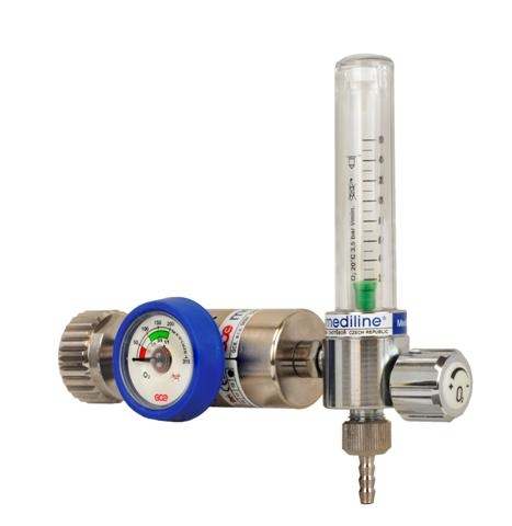 Druckminderer für medizinischen Sauerstoff. Mit Flowröhrchen
